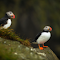 The interface is an image of two birds with large, red beaks, orange legs, black and white feathered bodies, wings and necks standing on a rock with a beautiful green grass ledge next to them.